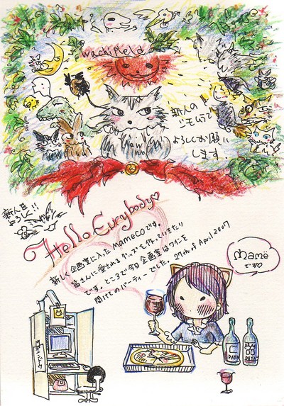 今年のわちふぃーるどはすごいよ。新入社員が一度に三人!店舗での研修を終えて、アトリエにふたり、そして制作兼営業として鶴瀬にひとり、いずれもフレッシュデザイナーです。アトリエではワインを開けて、ちょっと歓迎パーティの際「自己紹介してみたら?」と言ったら、こんなに華やかに自己主張。意気込みが感じられていいねえ。この次は制作の新人「モテ髪のナカムラ」にも描いてもらおう。