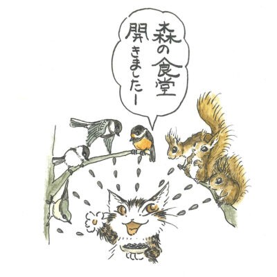 スカスカになった森にはリスが3匹とガラ系の鳥、